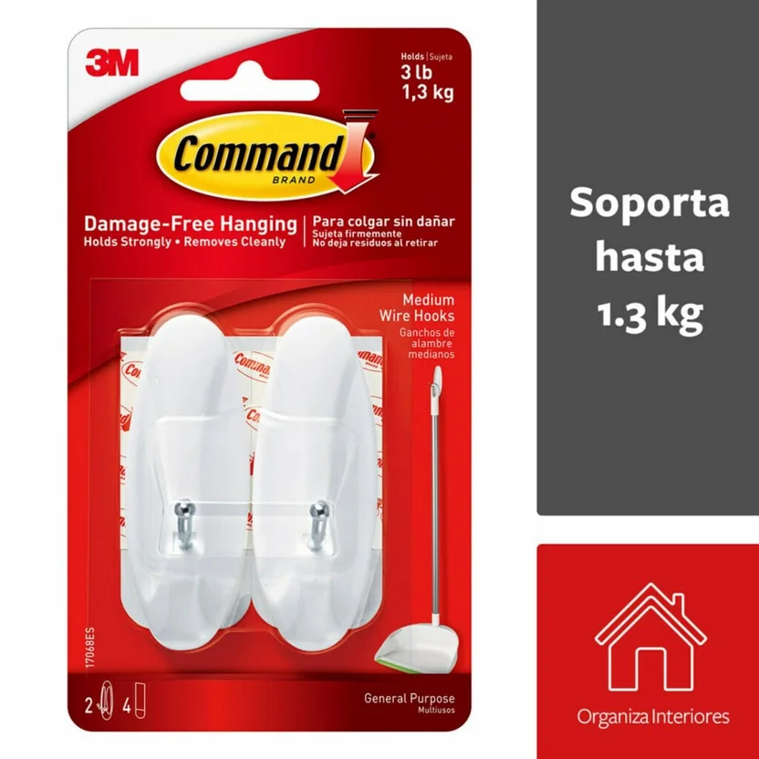 Estos ganchos medianos de alambre soportan hasta 1.3 kg, perfectos para colgar una variedad de objetos. Su diseño autoadhesivo permite una instalación fácil y sin necesidad de herramientas. Además, se remueven limpiamente, sin dejar residuos.