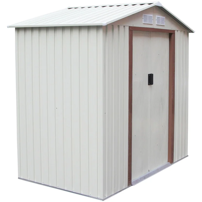 Esta caseta de la marca Ergo, fabricada en acero, cuenta con dos puertas deslizables y ventilación para mantener tus objetos protegidos y en buen estado. Sus manijas tienen un agujero para ponerle un candado (no incluido), brindando mayor seguridad. Se recomienda instalarla en una zona pareja donde no se acumule el agua.
