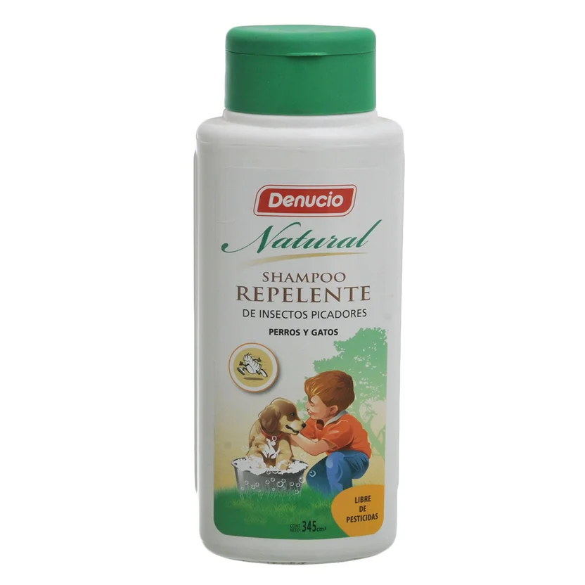 Este shampoo de tipo repelente, de color blanco, está formulado con ingredientes como sulfato de sodio, coco, cloro, cloruro de sodio, metil, citronella y agua. Proviene de Uruguay y es el modelo 2291 de la marca Denucio.
