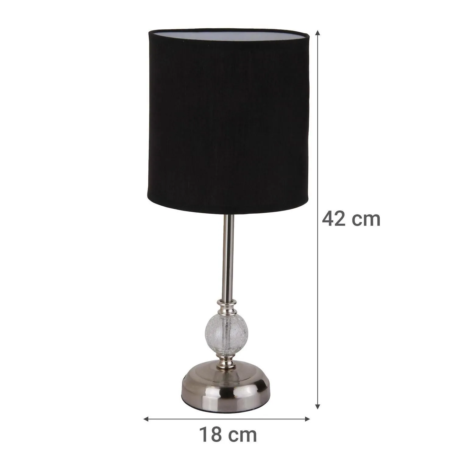 La Lámpara de mesa Firenze tiene una altura total de 42 cm y un diámetro de pantalla de 19 cm. Su estructura de metal y su pantalla negra le dan un toque de elegancia y sofisticación. Cuenta con un cable de 120 cm de largo y un interruptor en el cable para facilitar su uso. Admite una lamparita E27 con una potencia máxima de 60 w.