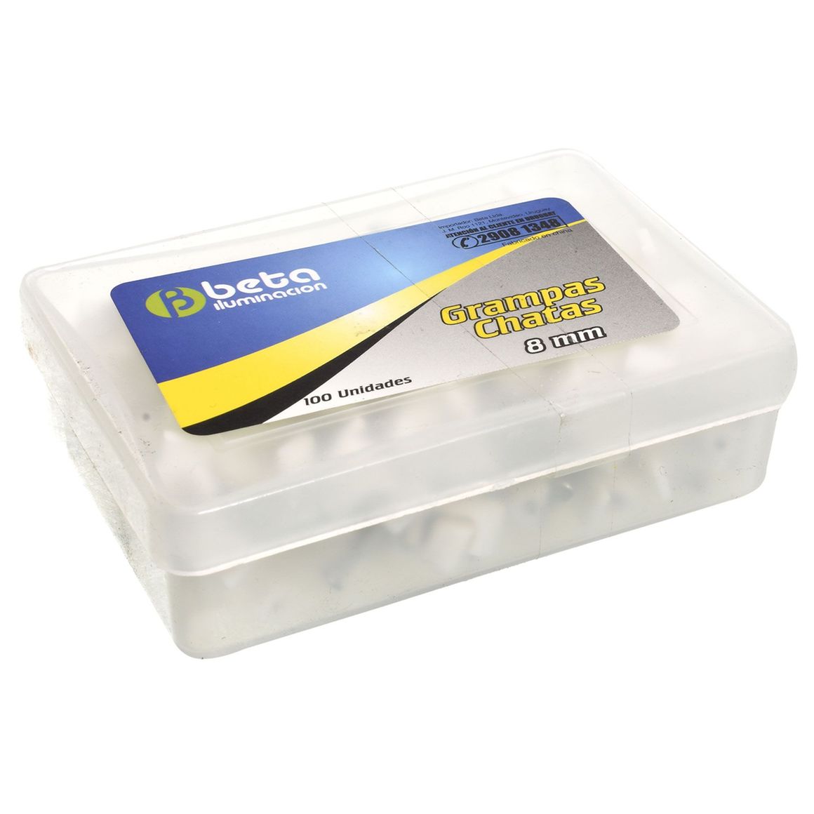 Las grampas chatas Nº 8 de Beta son de plástico y metal, con un diseño blanco que se adapta a cualquier ambiente. Vienen en una caja de 100 unidades, con un tamaño de 8 mm, perfectas para sujetar cables de forma segura y ordenada. Su uso es ideal para cables, y son de origen chino.