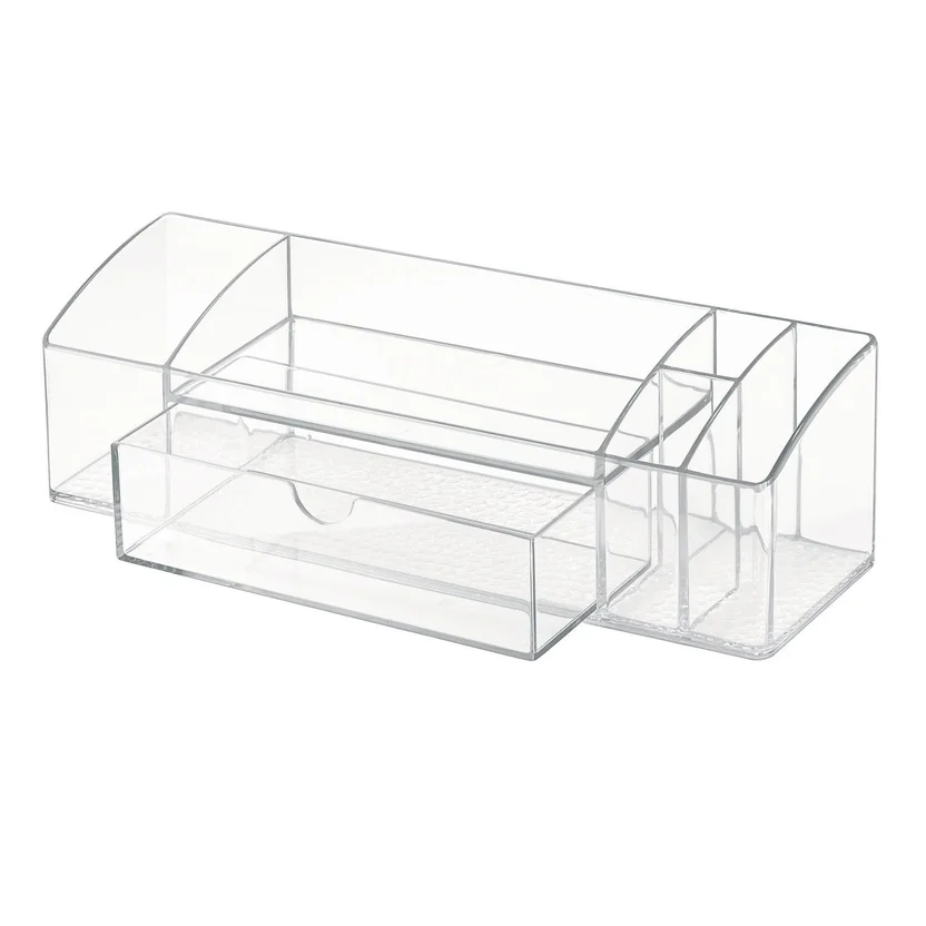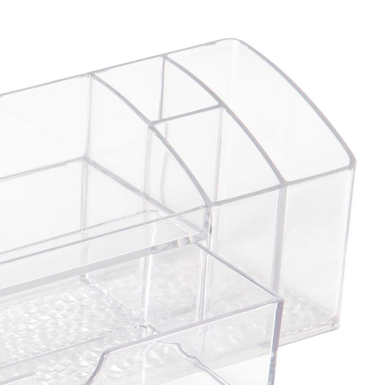 Organiza tu maquillaje de forma práctica y elegante con este organizador de Interdesign. Su diseño transparente te permite ver fácilmente tus productos, mientras que sus compartimentos te ayudan a mantener todo en su lugar. Con un cajón extraíble para guardar tus artículos más pequeños, este organizador es perfecto para mantener tu tocador ordenado y sin desorden.