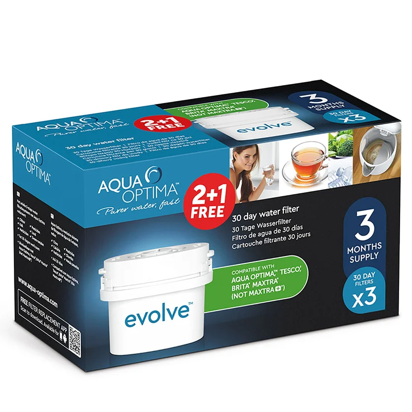 El Filtro Evolve pack por 3 unidades está hecho de plástico y es compatible con las jarras de agua de las marcas Aqua Optima, Tesco y Brita (excepto Brita Maxtra). Cada filtro tiene una duración de 30 días y te permite disfrutar de agua pura y fresca sin necesidad de cambiar el filtro con frecuencia. El pack incluye 3 unidades, lo que te asegura un suministro constante de agua filtrada.