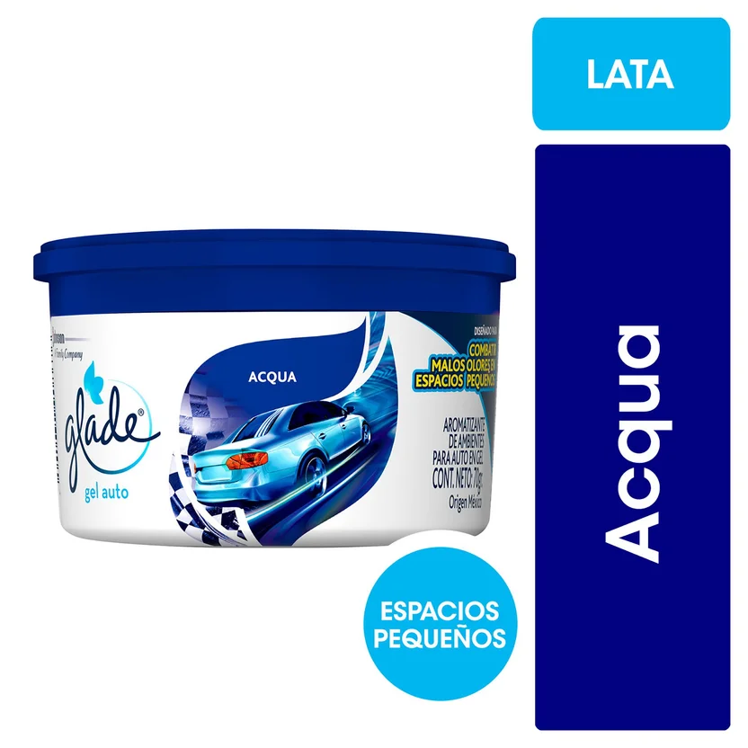 El Aromatizante Mini Gel Acqua de Glade está elaborado con un material plástico resistente y tiene un tamaño de 5 cm de ancho y 3 cm de alto. Su contenido de 70 g te ofrece una duración de hasta 2 años, y su aroma Acqua te permitirá disfrutar de un ambiente fresco y agradable en tu auto. La presentación en lata te permite colocarlo fácilmente en cualquier lugar.