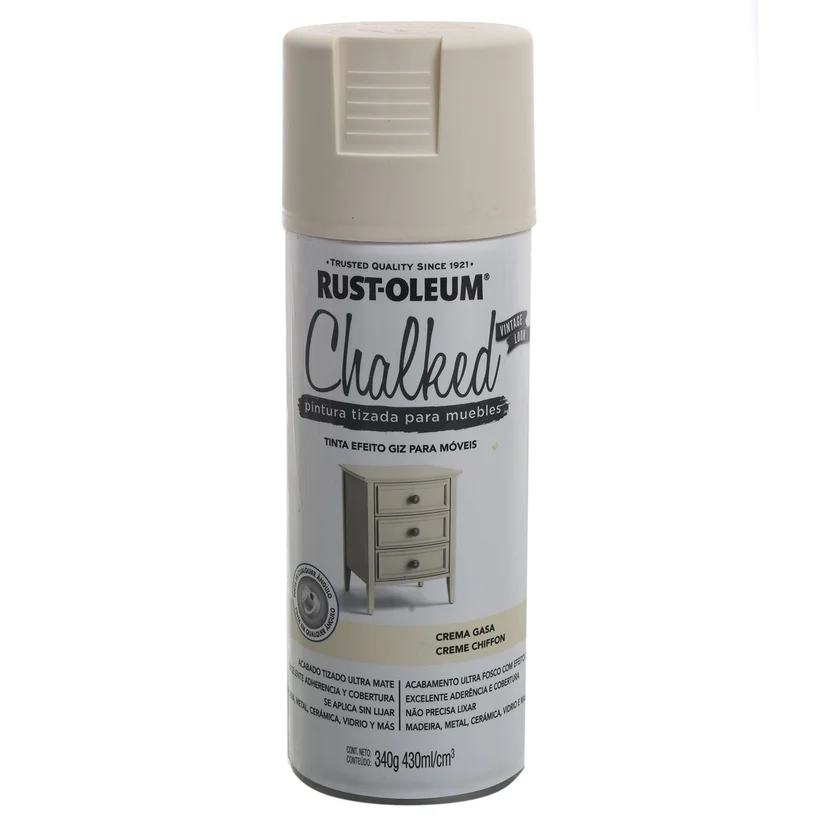 El Aerosol Chalked Crema Gasa de Rust-Oleum tiene un rendimiento de 1.1 m2 por capa y se recomienda aplicar 2 manos para un acabado perfecto. Es ideal para uso en interiores y exteriores, y se seca en tan solo 1 hora entre manos. Su origen es Estados Unidos y se recomienda almacenarlo en ambientes con temperaturas menores a 48 grados. No olvides que no se debe aspirar ni exponer a altas temperaturas.