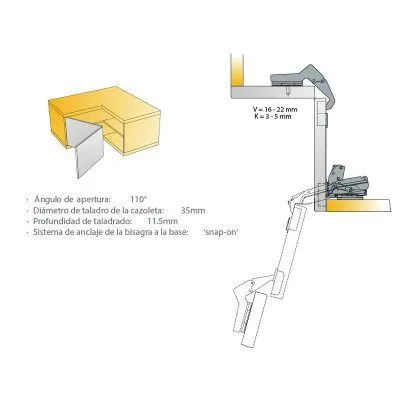 Esta bisagra cuenta con un ángulo de apertura de 110°, un diámetro de cazoleta de 35 mm y una profundidad de taladro de 11,5 mm. Su sistema de anclaje clip a la base te permite instalarla de forma rápida y sencilla. Además, su cierre suave regulable te permite personalizar la velocidad de cierre de la puerta.
