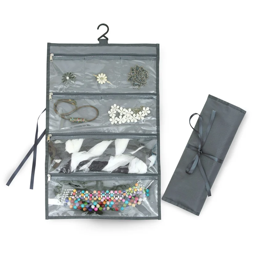 Organiza tus accesorios de viaje con este práctico organizador de tela y plástico. Con sus 4 niveles, podrás guardar tus joyas, cosméticos y otros artículos de forma ordenada y segura. Su diseño compacto y ligero lo hace ideal para llevar en tu maleta o bolso de mano. ¡No te preocupes por el desorden en tus viajes!