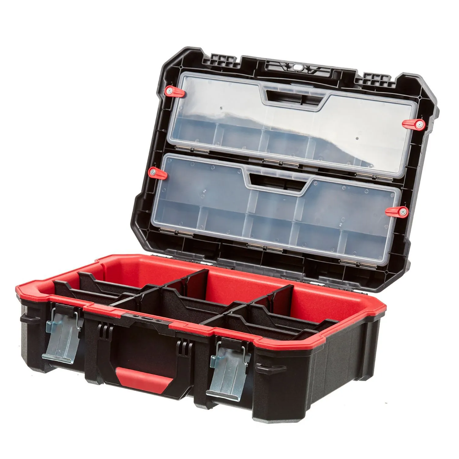 Este organizador de herramientas está fabricado en plástico resistente y cuenta con un diseño de doble capa con divisiones para organizar tus herramientas de forma eficiente. Su tamaño es de 19 cm de alto, 39 cm de ancho y 49.5 cm de profundidad, lo que te permite guardar una gran cantidad de herramientas. Además, cuenta con una garantía de 3 meses.