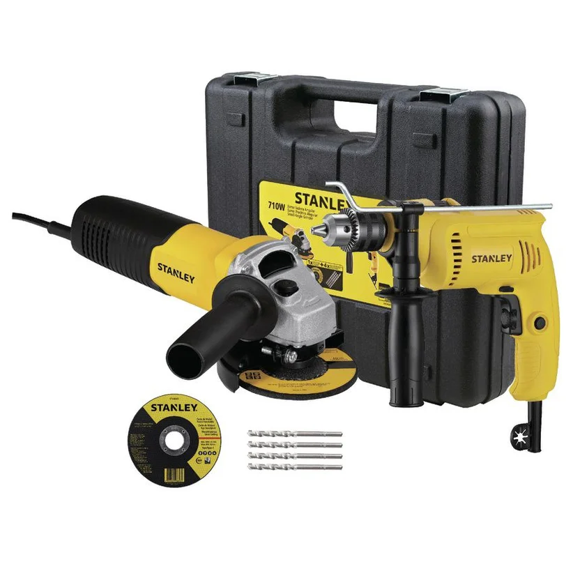 Si estás buscando un set de herramientas que te permita realizar una variedad de tareas, el Taladro percutor 600 W 13 mm + Amoladora 710 W 115 mm de Stanley es la opción ideal. Con este set podrás perforar, taladrar y esmerilar con facilidad, gracias a su potencia y versatilidad. Además, incluye mechas para que puedas comenzar a trabajar de inmediato. ¡No pierdas la oportunidad de tener este set de herramientas completo y de alta calidad en tus manos!