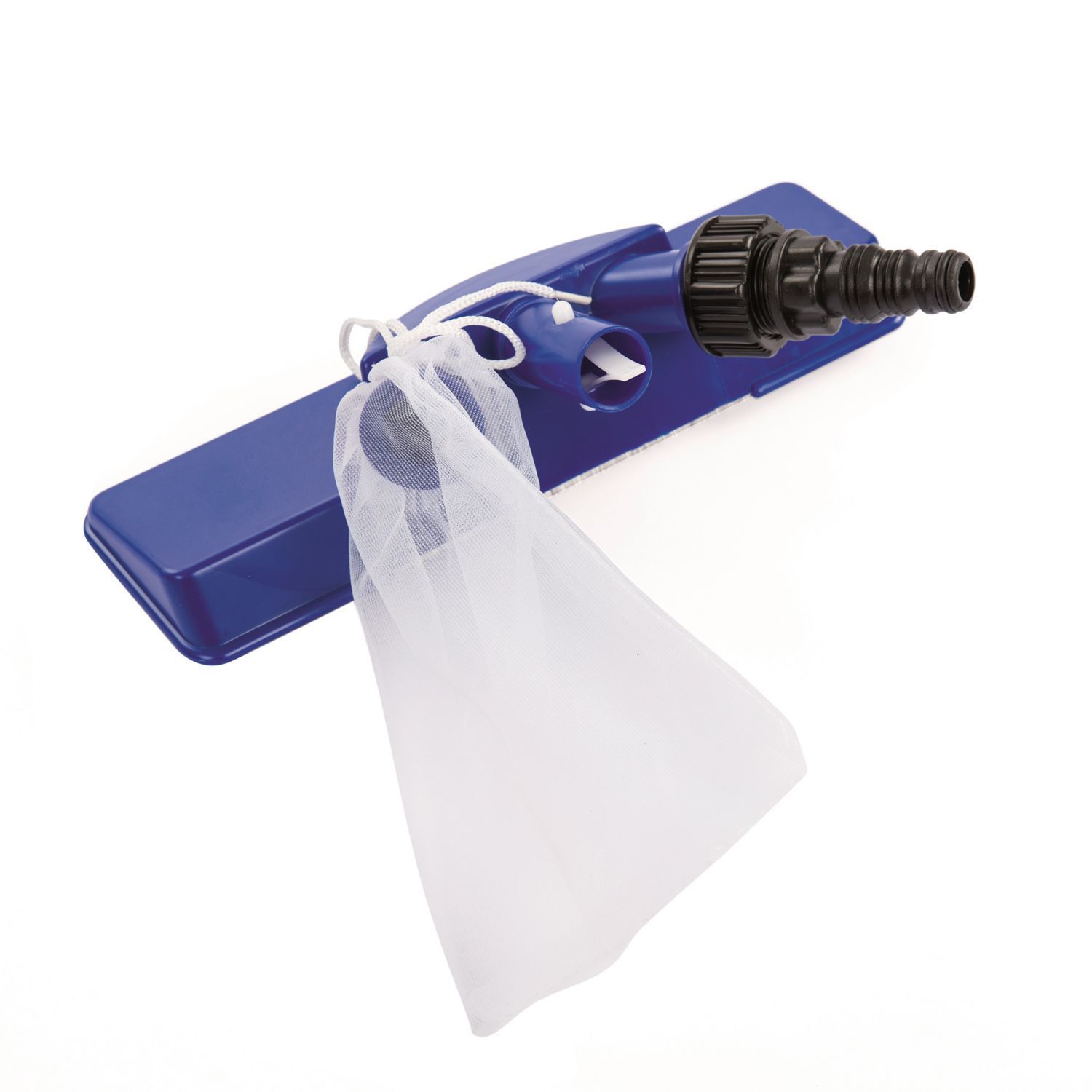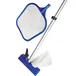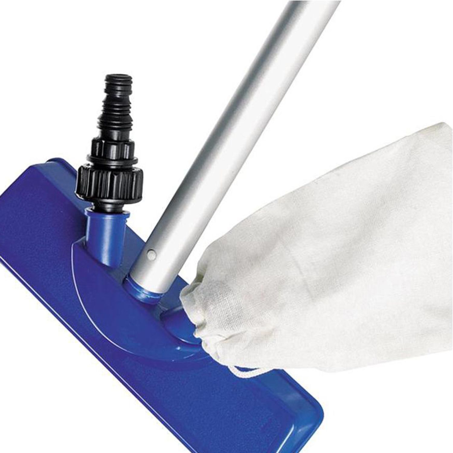 Este limpiafondo de piscinas, de color azul, está fabricado con metal y plástico, lo que garantiza durabilidad y resistencia. El kit incluye un limpiafondos y una red para recoger hojas y otros residuos. Con este kit, el mantenimiento de tu piscina será más fácil y rápido.