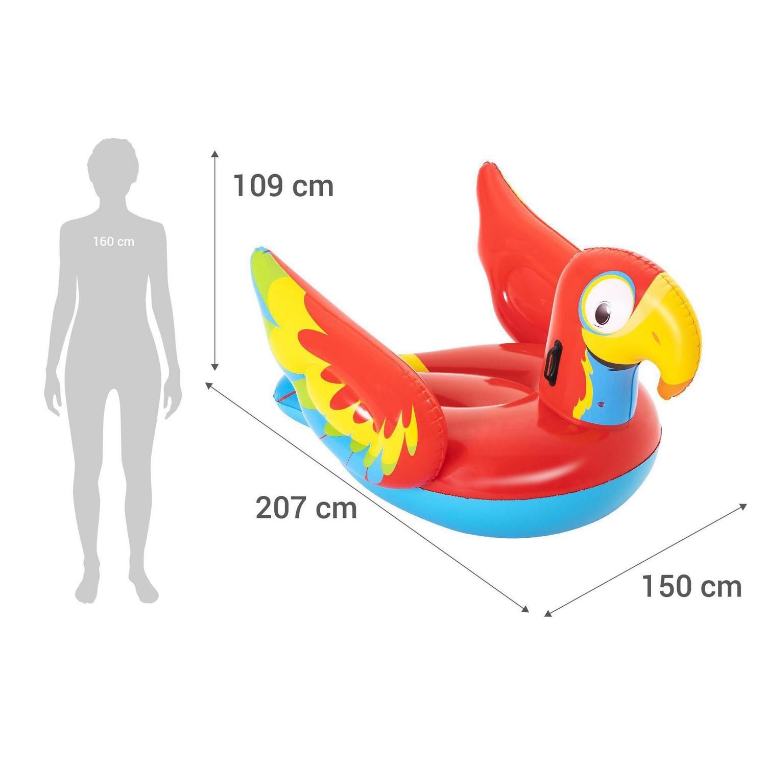 El flotador inflable loro Peppy está hecho de PVC resistente y duradero, y tiene un tamaño de 207 cm de ancho, 150 cm de largo y 109 cm de alto. Es ideal para niños y adultos, y tiene una edad recomendada de 14 años en adelante. Además, incluye dos manillas para mayor seguridad y comodidad. El flotador es de color multicolor y tiene un diseño divertido y colorido. Se recomienda su uso bajo la supervisión de un adulto.