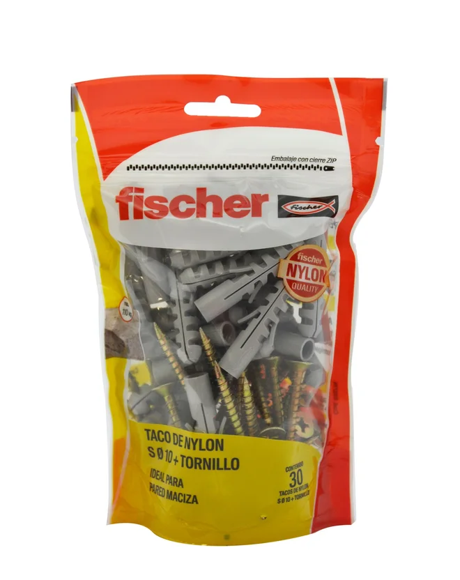 Este set incluye tarugos y tornillos de nylon, con un diámetro de 10 ml. El contenido del producto es PO 30 S10 + TMF 6x60, fabricado en Argentina. Este producto es de la marca Fischer.