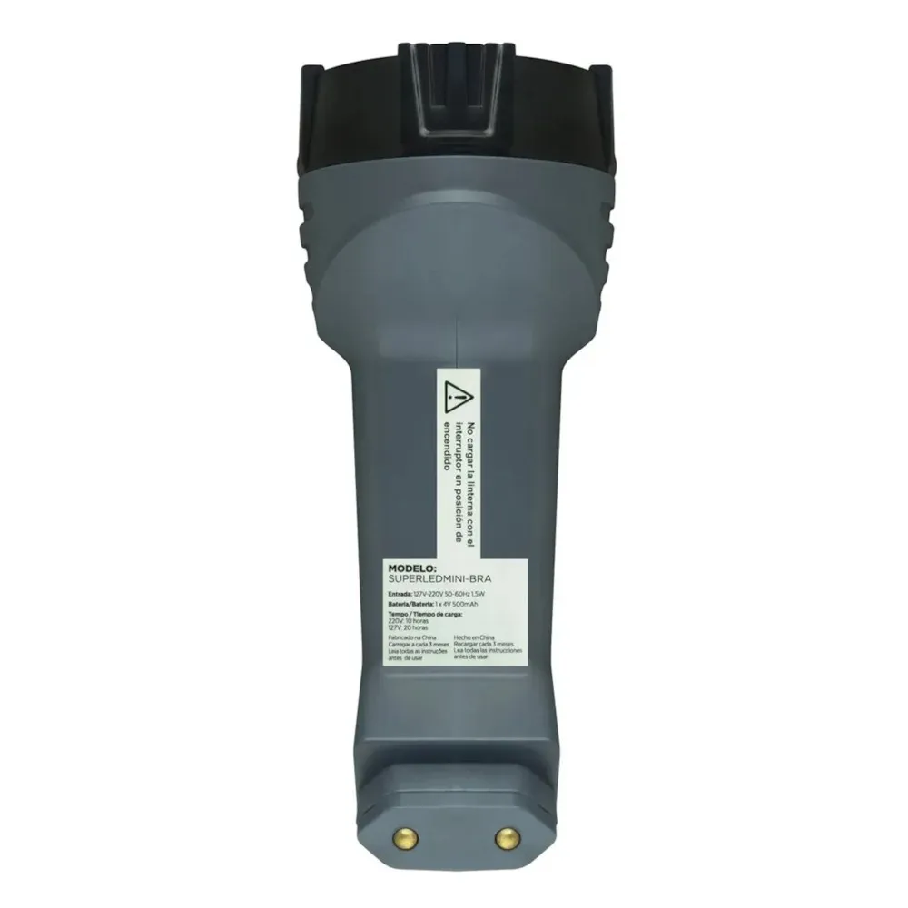 Esta linterna de tipo recargable, fabricada en plástico, cuenta con una autonomía que no se especifica. Sus características incluyen tecnología Super LED. Con un alto de 15 cm y un ancho de 7 cm, es fácil de transportar. El tiempo de carga es de 12 hs.