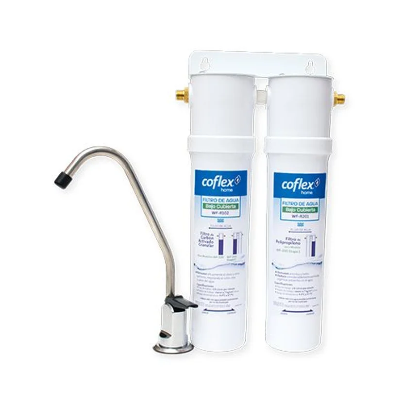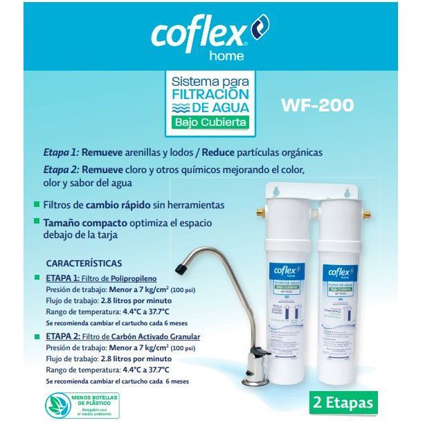 El Purificador de Agua Coflex WF-200 cuenta con un sistema de filtrado de 2 etapas. El filtro de polipropileno elimina las partículas grandes, mientras que el filtro de carbón activado granular elimina el cloro y otros químicos, mejorando el sabor y el olor del agua. Su montaje es bajo mesada y está fabricado con polietileno. El modelo WF-200 es de origen México y su color es blanco.