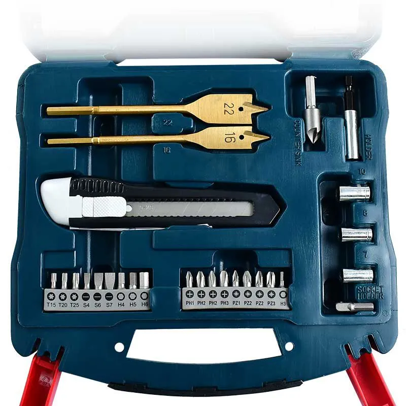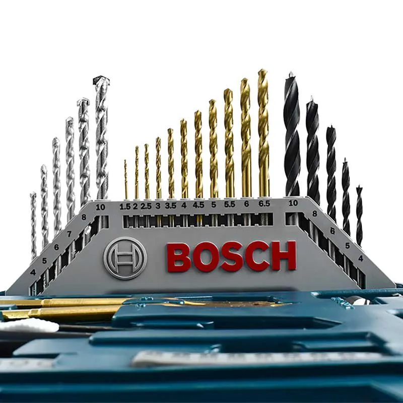 Este set incluye 11 mechas para metal de titanio, 6 mechas para mampostería, 5 mechas para madera, 2 mechas de fresa plana de titanio, 18 puntas, un soporte universal magnético, 3 llaves de caja, un adaptador para llaves de caja, un estilete, un calibre de diámetros, un avellanador y una maleta plástica para almacenamiento. Todo lo que necesitas para trabajar con precisión y eficiencia.