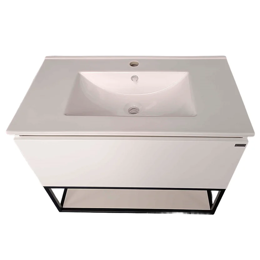 Este mueble de baño cuenta con una estructura de MDF y metal, lo que garantiza su durabilidad. Incluye una mesada de loza y un lavamanos, además de un práctico cajón para guardar tus objetos personales. Sus dimensiones son de 80 cm de ancho, 45 cm de profundidad y 65 cm de alto. El mueble cuenta con cierre suave y un sistema de fijación al muro.
