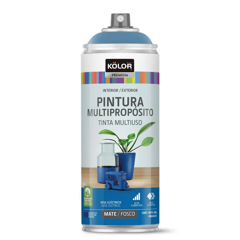 El Aerosol Azul Eléctrico de Kolor es una pintura multipropósito de base acuosa, con un rendimiento de 2.75 m2 por capa. Su fórmula es resistente al agua y cuenta con protección UV, lo que la hace ideal para uso en interiores y exteriores. Además, es lavable y tiene una garantía de 6 meses. ¡Con este aerosol, podrás renovar tus proyectos con facilidad y obtener resultados duraderos!