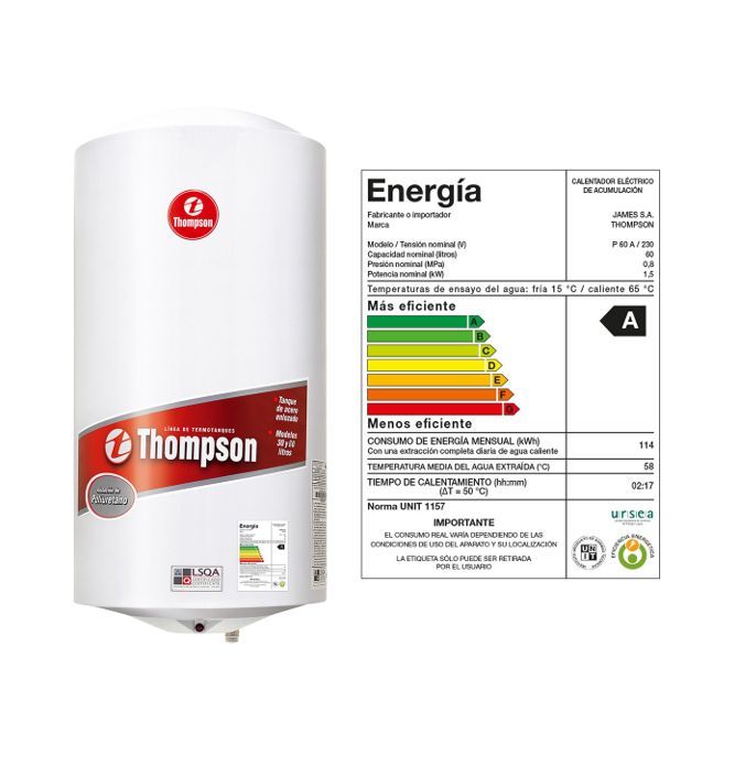 Este calefón eléctrico Thompson cuenta con un tanque de acero y una capacidad de 60 L, ideal para cubrir tus necesidades de agua caliente. Su eficiencia energética es de clase A, lo que te permite ahorrar energía. Con una potencia de 1500 W y una temperatura máxima de 65°, disfrutarás de agua caliente en todo momento. Además, su garantía de 12 meses en la parte eléctrica y 3 años en el tanque te brindan tranquilidad.