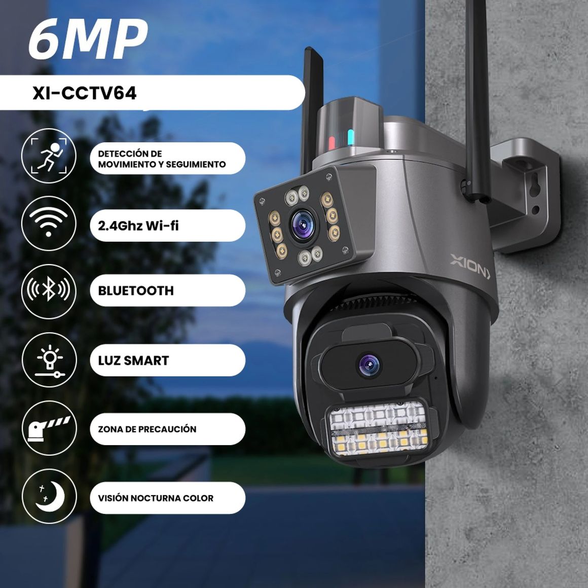 ¡Protegé tu hogar con la Cámara Smart Doble Wifi Interior y Exterior Xion! Con su visión nocturna, podrás mantener vigilado tu espacio las 24 horas del día. Su ángulo de visión de 360° te permitirá cubrir una amplia zona, y su conexión Wifi y cable te dará flexibilidad de instalación.