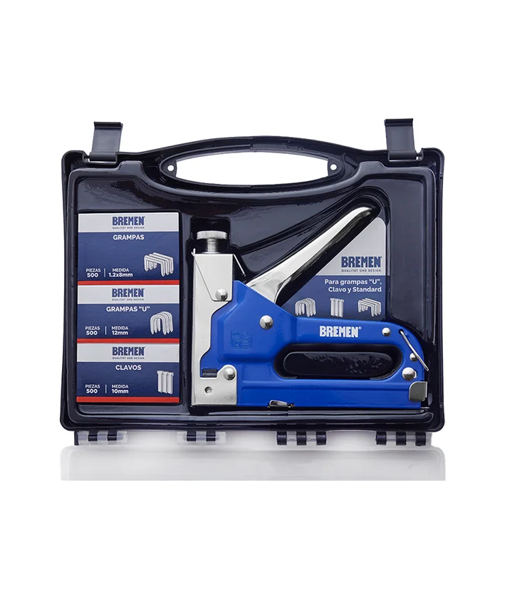 ¡Dale un toque profesional a tus proyectos con esta Engrampadora Clavadora Bremen! Diseñada para trabajos exigentes, esta herramienta es tu aliada perfecta para tapicería, construcción en seco y carpintería. Su robusto material metálico y su diseño ergonómico te aseguran comodidad y durabilidad en cada uso.