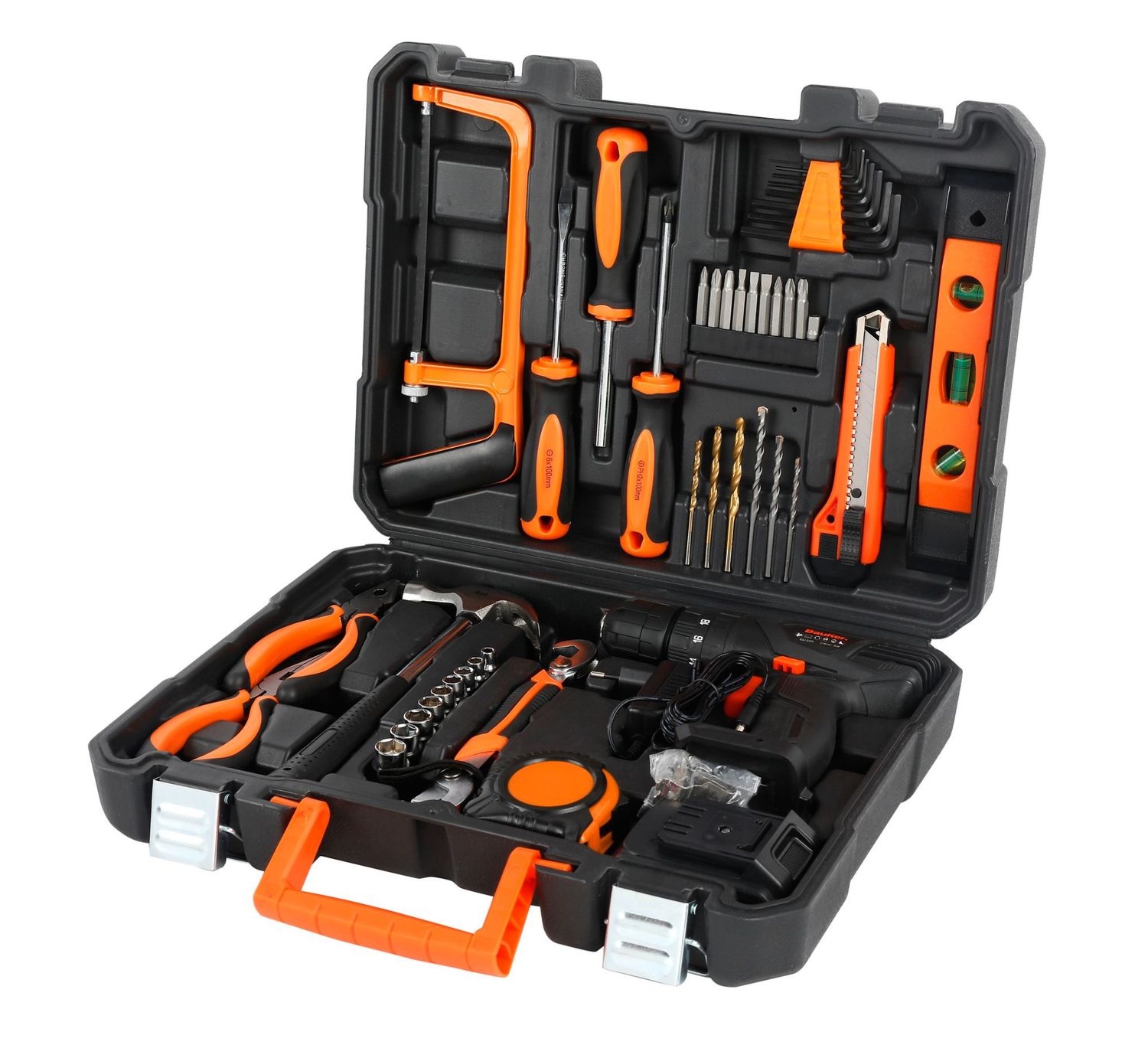 Kit de taladro inalámbrico y herramientas manuales con maletin