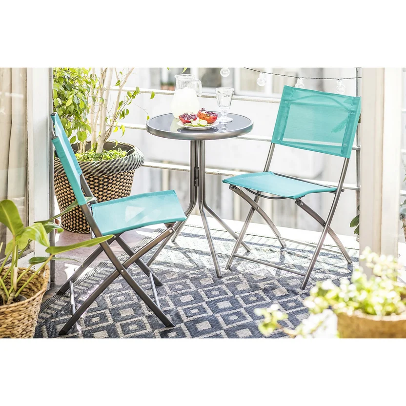 Dale un toque de color y estilo a tu balcón con el Juego de balcón Capuccino 3 piezas turquesa de Just Home Collection. Este juego, ideal para dos personas, te permitirá disfrutar de momentos al aire libre con comodidad y diseño. Sus sillas plegables te brindan la practicidad que necesitas para guardarlas fácilmente cuando no las uses, y su mesa con tapa de vidrio le da un toque moderno a tu espacio.
