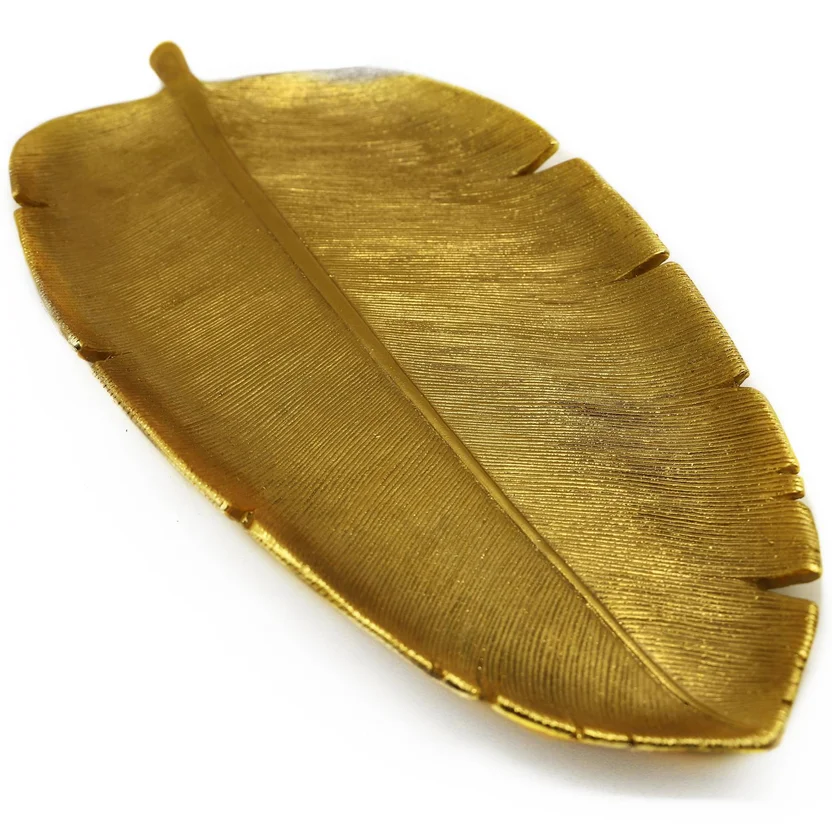 Esta pieza decorativa tiene un ancho de 49 cm y un largo de 22 cm, con un alto de 3.5 cm. Es una sola pieza, perfecta para colocar en una repisa, mesa o cualquier superficie que desees destacar. Su material es poliresina, lo que la hace resistente y fácil de limpiar. El diseño en forma de hoja dorada le da un toque sofisticado y moderno a tu decoración.