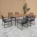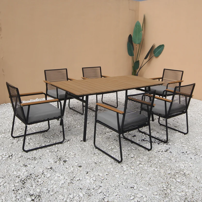 ¡Dale un toque de elegancia a tu jardín con el Juego de comedor exterior Granada! Este conjunto de 7 piezas en color negro es perfecto para disfrutar de tus momentos al aire libre. Incluye una mesa y 6 sillas, ideal para compartir con familia y amigos.