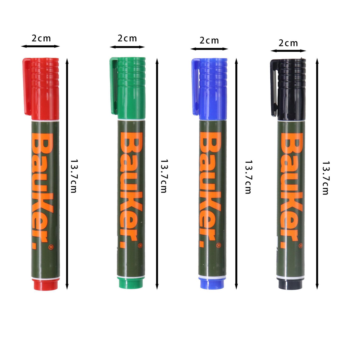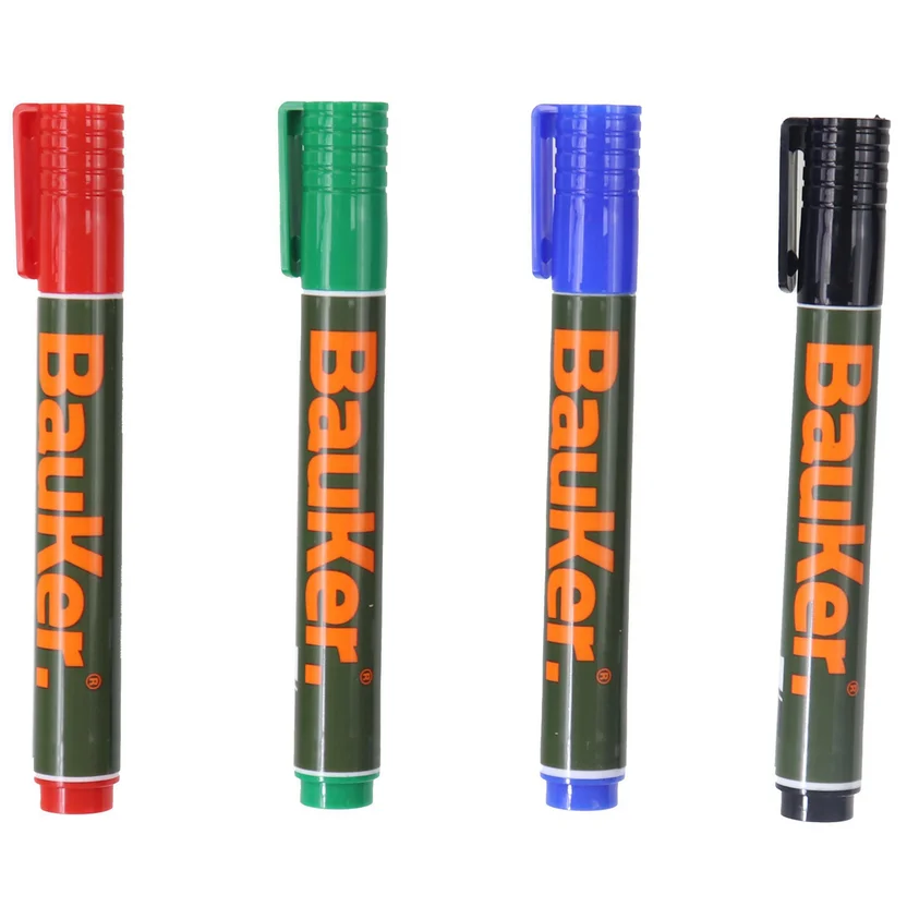 ¡Dale vida a tus ideas con el Pack de 4 marcadores permanentes Bauker! Con su tinta en colores Negro, Rojo, Azul y Verde, podrás destacar y crear con facilidad. ¡No te quedes sin el tuyo!
