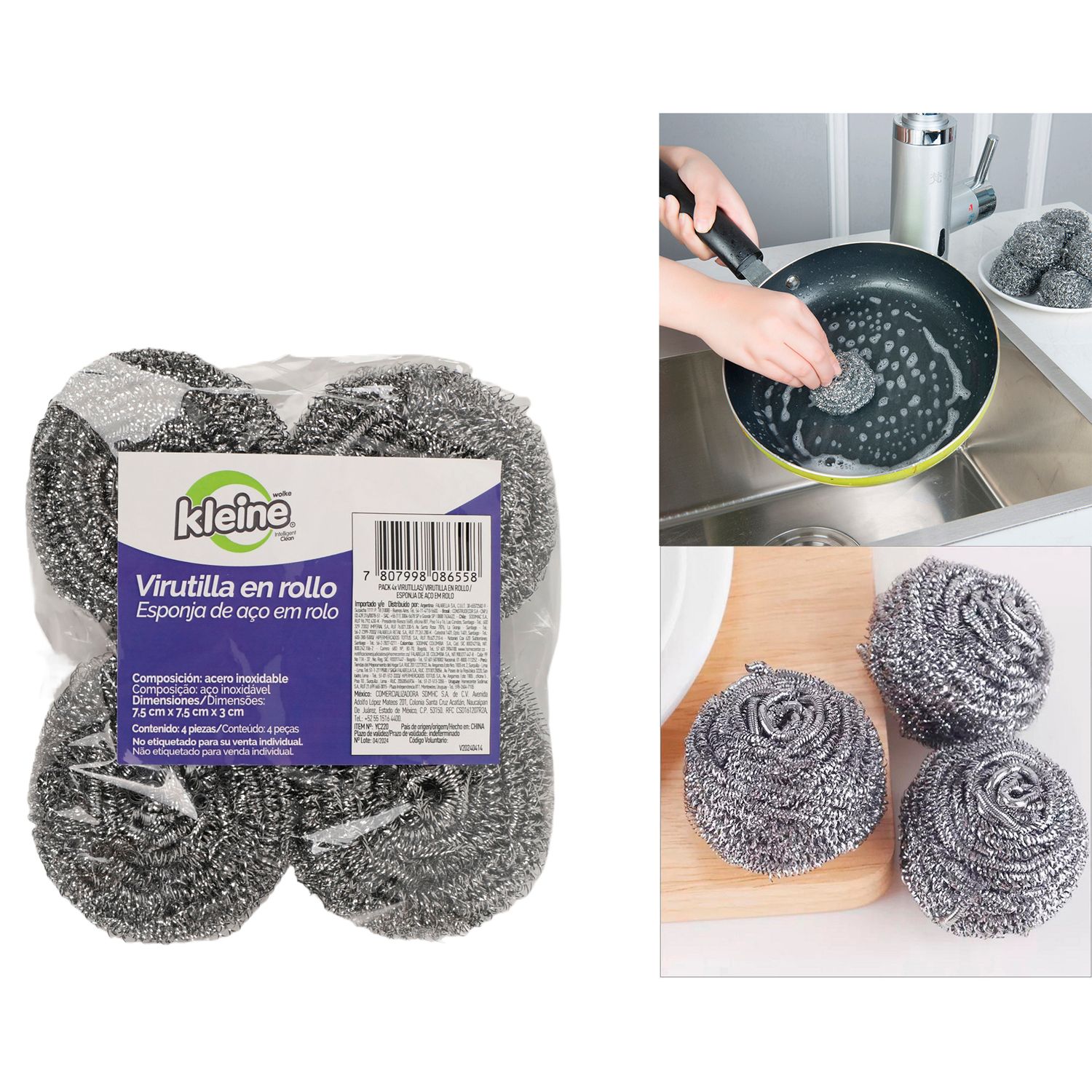 Este pack incluye 4 esponjas de acero, cada una con un ancho y largo de 7.5 cm, y una altura de 4 cm. Son ideales para la limpieza de diversas superficies. El modelo es YC220 y están diseñadas para ofrecer una limpieza efectiva y duradera. Cuentan con una garantía de 3 meses.