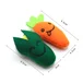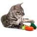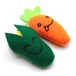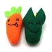 Estos juguetes para gato miden 9 cm de largo, 4 cm de ancho y 3 cm de alto. Están hechos de poliéster, son de color naranja y blanco, y tienen la forma de verduras con caritas sonrientes. Son ideales para gatos de todas las edades y vienen con una garantía de 6 meses.