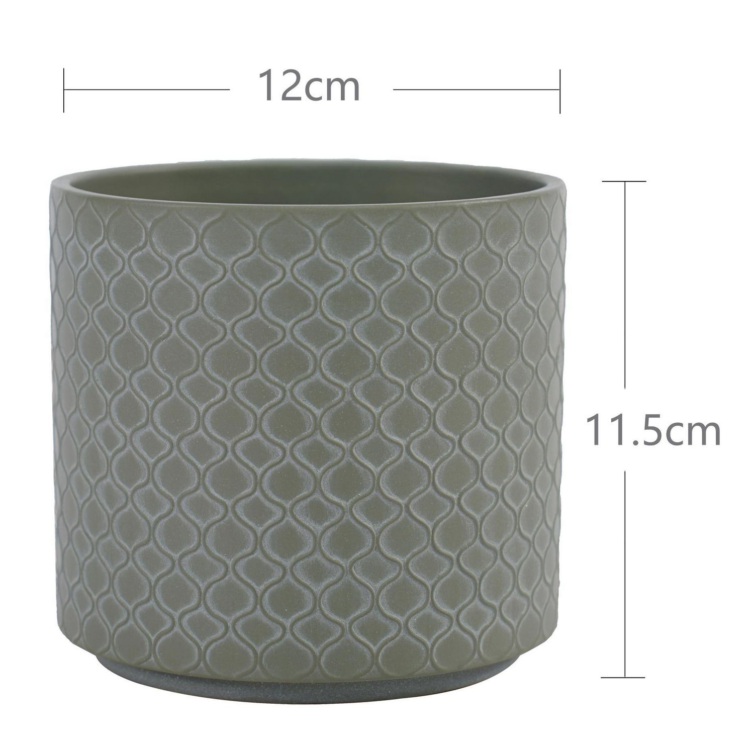 Fabricada en cerámica de origen chino, esta maceta tiene un diámetro y largo de 12 cm, y un alto de 11.5 cm. Incluye una sola unidad. Su diseño clásico y su forma cilíndrica la hacen ideal para una gran variedad de plantas. Es una maceta no autorregante.