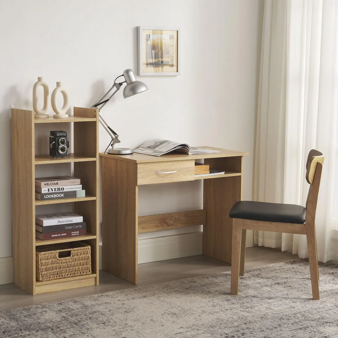 ¡Dale un toque moderno y funcional a tu espacio con el Set de Escritorio y Estante Ameri! Diseñado para optimizar tu área de trabajo o estudio, este set combina un escritorio espacioso con un estante organizador, ideal para mantener todo a mano y con estilo. Su acabado en roble le da una calidez única a cualquier ambiente.