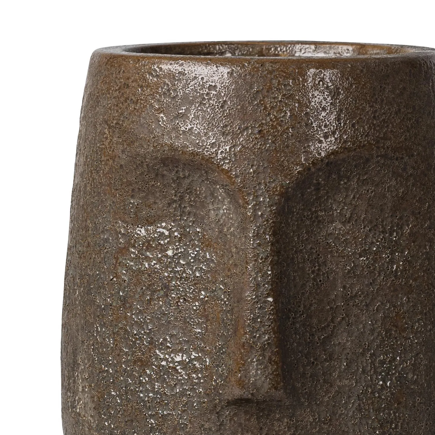 Dale un toque de estilo único a tu hogar con esta maceta de arcilla color café. Su diseño con forma de rostro le dará un toque distintivo a cualquier espacio, ya sea en tu sala, dormitorio o jardín. Con sus 18 cm de alto y 14.5 cm de diámetro, es perfecta para plantas de tamaño mediano. ¡No esperes más para darle vida a tus espacios!