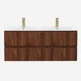 Este vanitory cuenta con 4 cajones con correderas de metal y un sistema de cierre suave, ofreciendo un amplio espacio de almacenamiento. Su estructura es de MDF y melamina, con un espesor de 15 mm, garantizando durabilidad. Incluye lavamanos y sistema de fijación al muro.