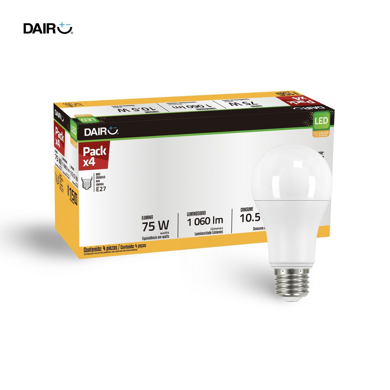 Iluminá tus espacios con el Pack de 4 lámparas LED A60 E27 de luz cálida. Con una potencia de 75 W y un flujo luminoso de 1060 lm, estas lámparas Dairu ofrecen una iluminación eficiente y un ambiente acogedor. ¡Dale un toque cálido a tu hogar con esta excelente opción!