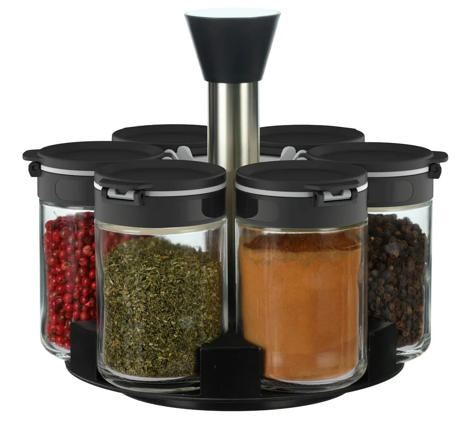 Este set de especieros, de la marca Just Home Collection, es de origen chino y está fabricado en vidrio, lo que garantiza su durabilidad y facilita su limpieza. El modelo 79352005, de color negro, incluye 7 piezas, ya que además de los 6 especieros, viene con una base. Sus dimensiones son de 17.4 x 19.1 x 19.1 cm, y son aptos para lavavajillas.