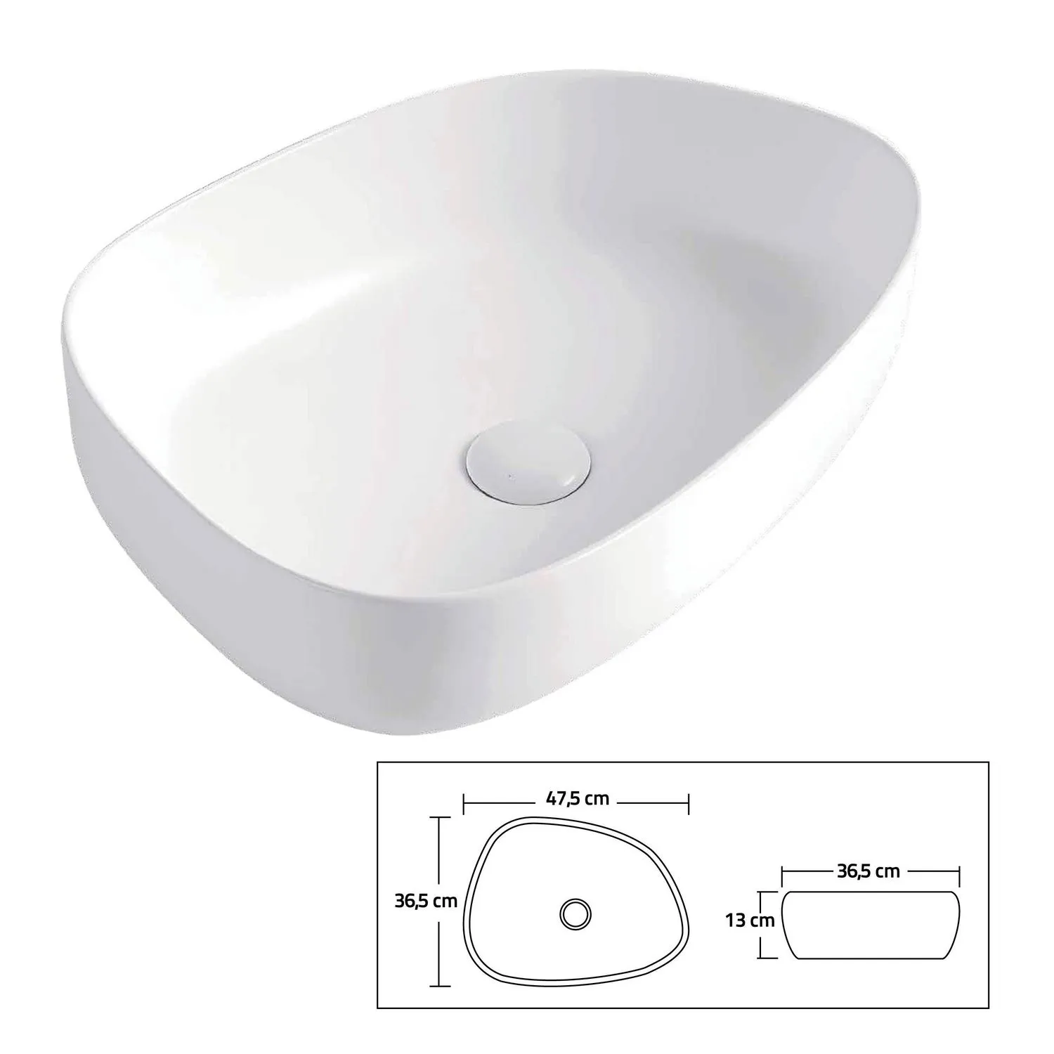 Esta bacha de apoyo, fabricada en cerámica, cuenta con una capacidad volumétrica de 21 litros y un diseño ovalado. Su instalación es sobrepuesta, lo que facilita su colocación. Incluye desagüe y tiene una profundidad de cubeta de 36.5 cm. Sus dimensiones son: 47.5 cm de ancho y 13 cm de alto.