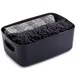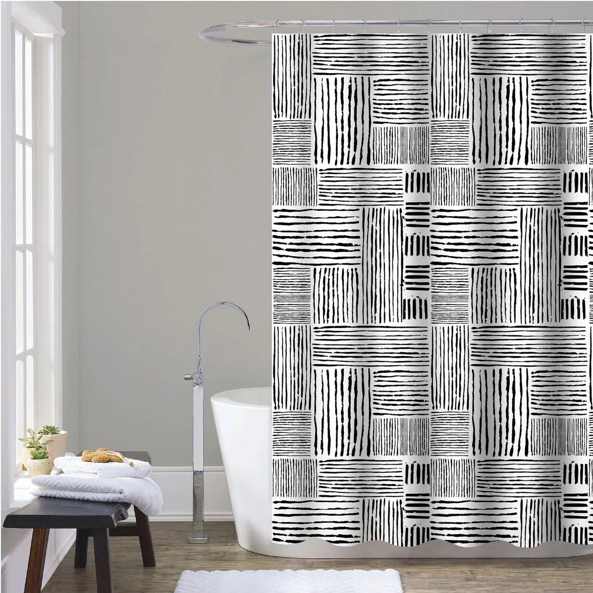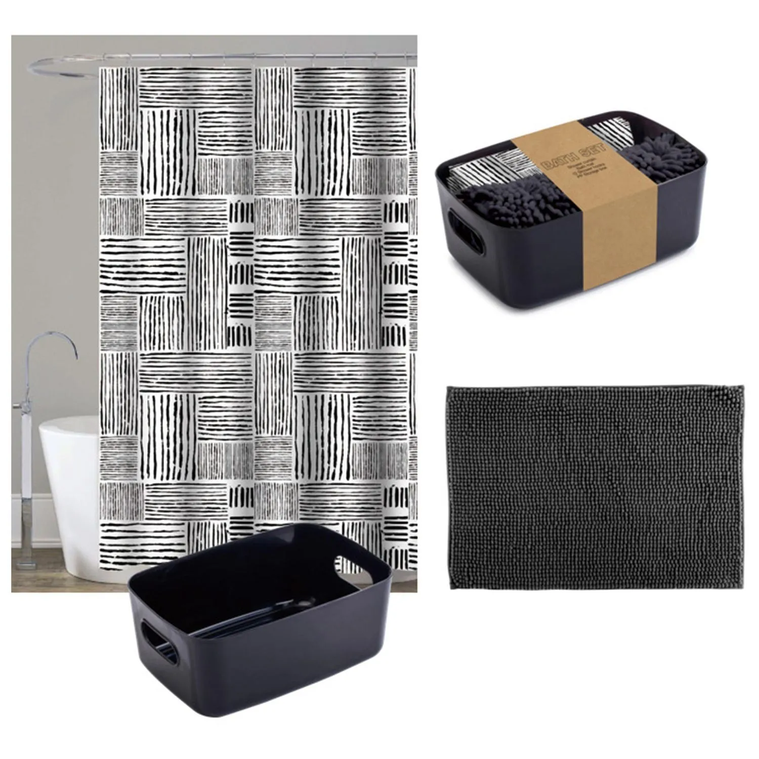 Renová tu baño con este set de 3 accesorios en negro y blanco. Incluye una cortina, una alfombra y una caja plástica, todo lo que necesitás para darle un toque moderno y funcional a tu espacio.