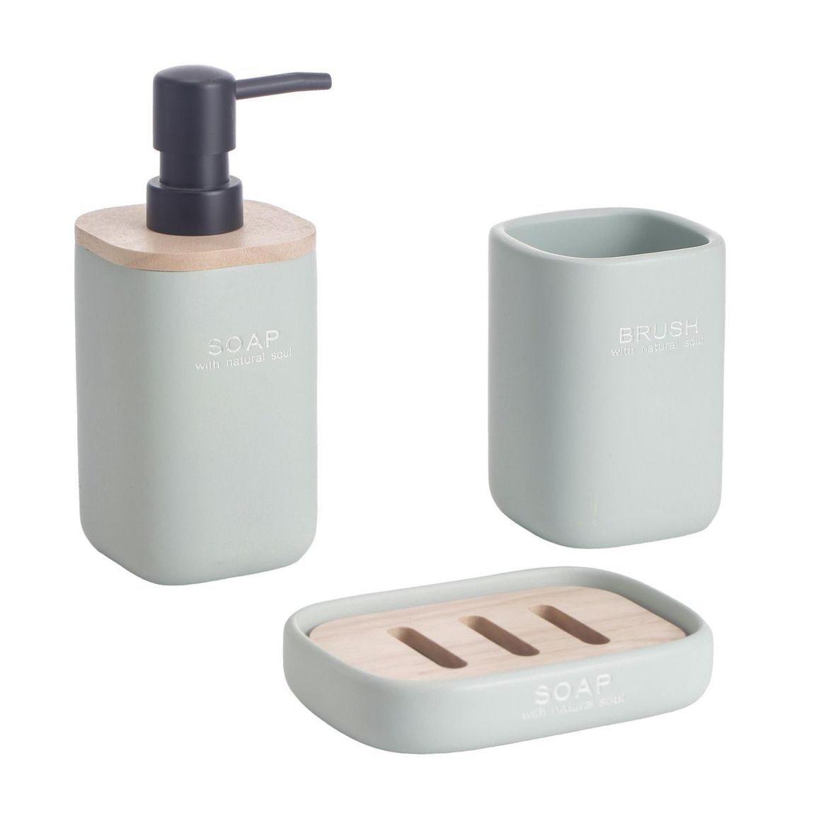 Dale un toque de frescura y elegancia a tu baño con el set de 3 accesorios Word verde de Just Home Collection. Este conjunto incluye un dispensador de jabón, un vaso y una bandeja para jabón, todo en un vibrante color verde que transformará tu espacio.